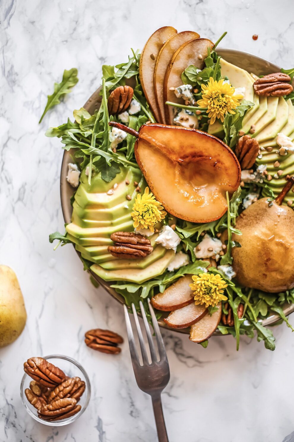 Salade de poires caramélisées au vin, bleu de chèvre & noix de Pécan